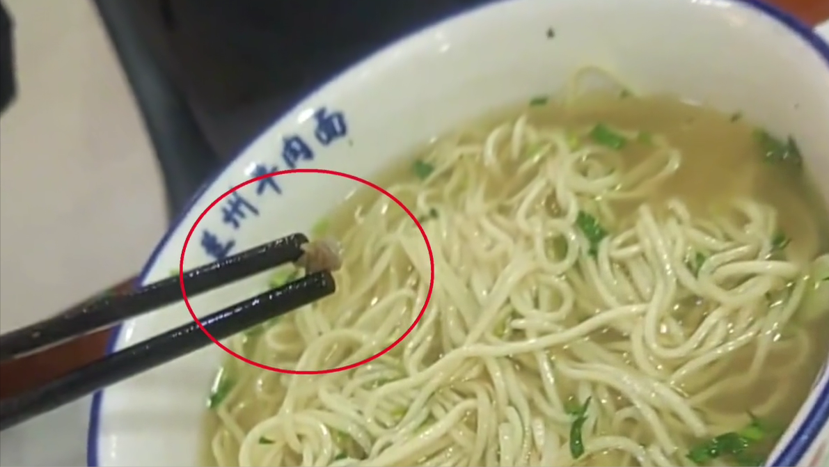 最终,在店员的帮助下,男子在碗底发现一小块牛筋。之后,又在男子的再三质疑声中,店员表示:传统牛肉面就是这样,只有四五块小牛筋,没有肉。