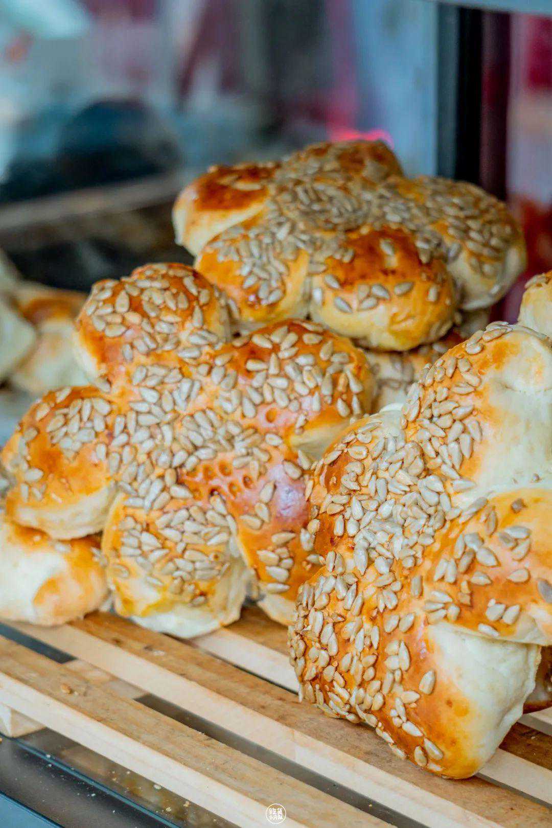 为了保证烤馕和烤包子的口感,他们家都是每小时出炉一次,每次只做1-2种馕。还有羊肉烤包子、花生馕、葡萄馕、窝窝馕等等,想吃就要踩点来,不然很快就卖光。