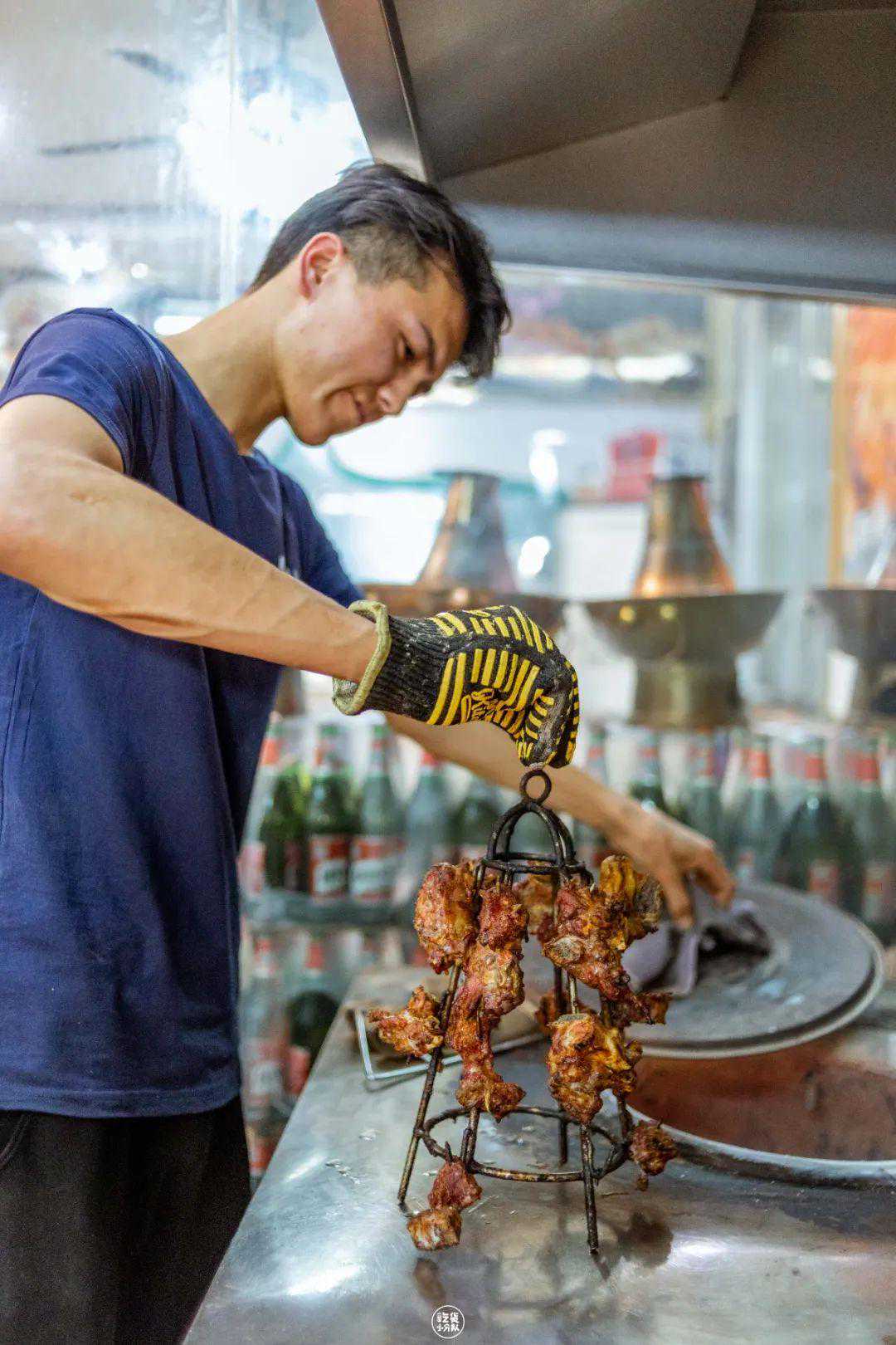 在白石洲居民楼下开了3年多的一家新疆大排档,是整条街唯一一家新疆餐厅。馕坑架子烤肉,将新鲜的羊肉挂在锥形架子上,再放进馕坑烤制。铁架和烤炉的双重热度,让羊肉全方位充分烤制将油脂逼出,出炉的羊肉香酥不腻。