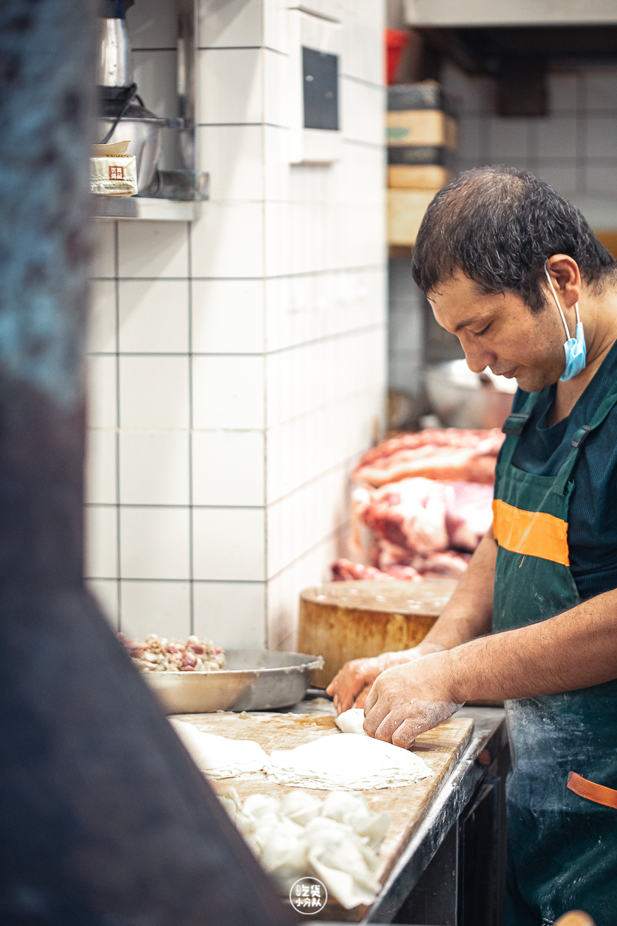 另一位负责烤肉的师傅库尔班江极力,就推荐我们可以将羊肉卷在馕里吃,羊肉的油脂和香味渗透在馕中,烤馕吃起来味道更香。
