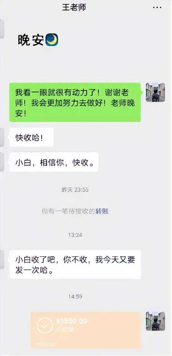 “爸!妈!王老师给我打了钱!我能不能收下?”玮玮举着手机,边喊边从房间里跑出来,这是他收到的第一份工资。“你不能收,现在你是实习阶段,还没有成为一名正职老师给王老师帮上忙。”