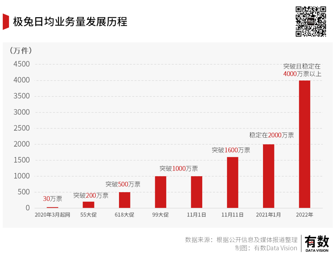 这是一个各取所需的选择:极兔需要拼多多的庞大商流,拼多多则想和阿里系切割,扶持自己的快递代理人。结果就是拼多多跑得有多快,极兔便跑得有多快——为了迈过“日均订单2000万”门槛,三通一达分别用了16-25年时间不等,极兔只用了10个月[5]。