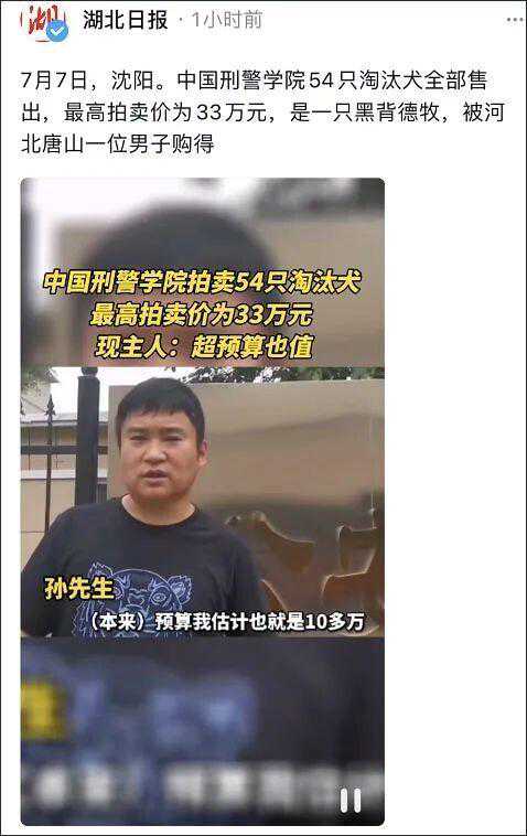 一批因太胆小、后肢软、年龄大等原因“考公”没成功的受训淘汰犬今天(7日)上午在沈阳公开拍卖,引发围观,据@报道,最终,所有淘汰犬全部售出,而最高成交价达到33万元,是一只黑背德牧,有网友调侃,“本来还在心疼狗狗没考上,结果没想到它包分配。”