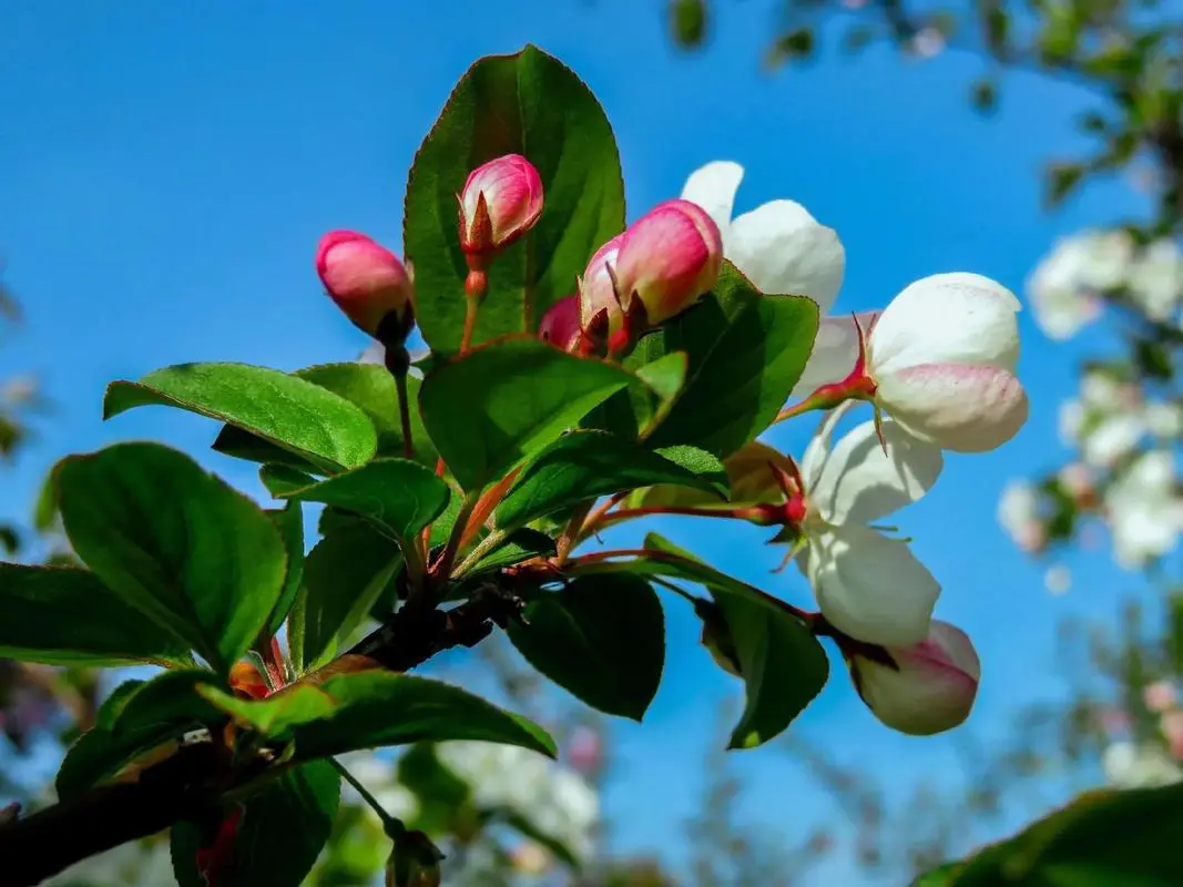西府海棠以其丰富的花色和优雅的姿态著称,它的花朵通常呈现出粉红色或淡红色,花瓣丰满且富有层次感。在春天,西府海棠的花朵盛开时,犹如一片粉色的海洋,给人带来无尽的愉悦和美感。