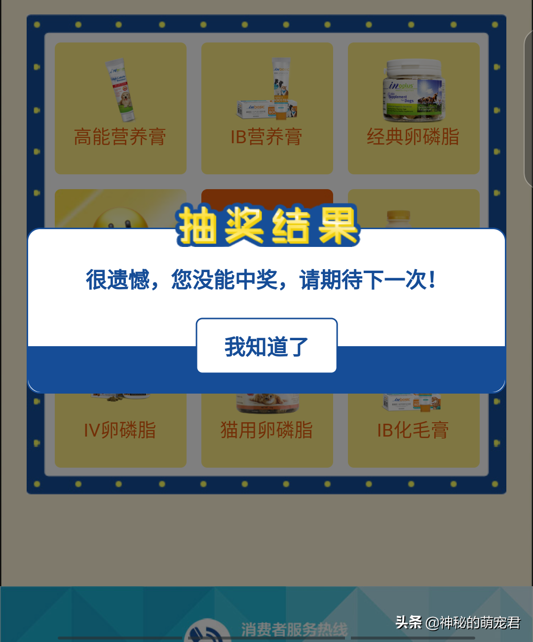 果然没中,我都有心理准备哈哈哈哈~不过身边就有宠友中奖了,希望我下次买的时候能中吧。