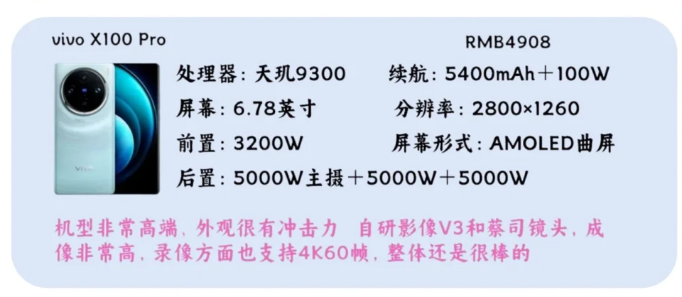 机型非常高端,外观很有冲击力自研影像V3和蔡司镜头,成像非常高,录像方面也支持4K60帧,整体还是很棒的