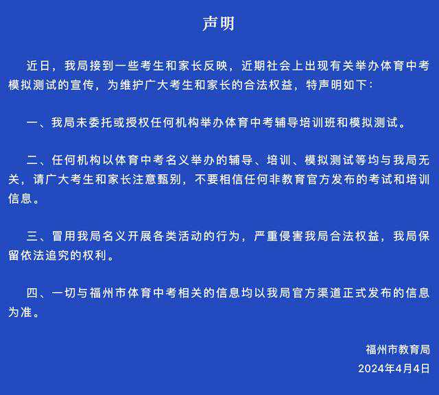 针对这一谣言,福州市教育局迅速作出回应。他们澄清表示,教育局并未发布任何关于举行体育中考模拟测试的通知,也没有此类计划。教育局强调,所有关于中考的信息都将通过官方渠道发布,请广大市民和学生保持警惕,不要轻信未经证实的信息。