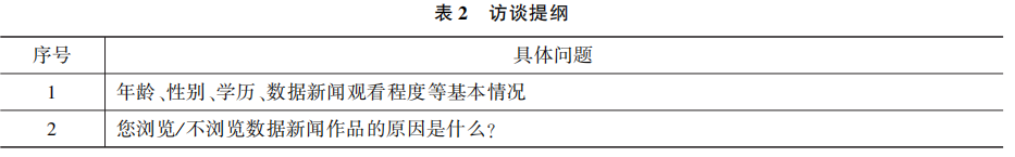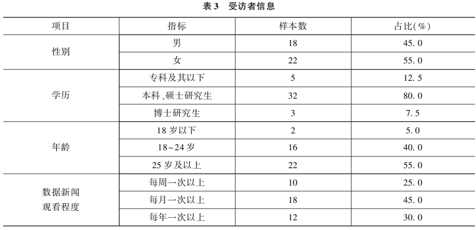 (二)数据收集与整理无论是线上访谈还是线下访谈,在征得访谈对象(受访者信息见表3)同意的前提下,都通过录音记录。每次访谈结束之后,及时将语音转换为文字资料,并及时撰写备忘录,分析单次访谈的得失和启发,为下一步的访谈做准备。受访者基本情况为:性别比例基本持平,本科及以上占比为87.5%,受访者以中青年为主,数据新闻观看程度以每月一次为主。其中,线上访谈以微信语音和腾讯会议完成,微信语音用于一对一访谈,腾讯会议用于小组访谈;线下访谈主要在家中和教室完成。线上访谈和线下访谈的平均访谈时间均在50分钟以上,单次最低访谈时间不少于40分钟。