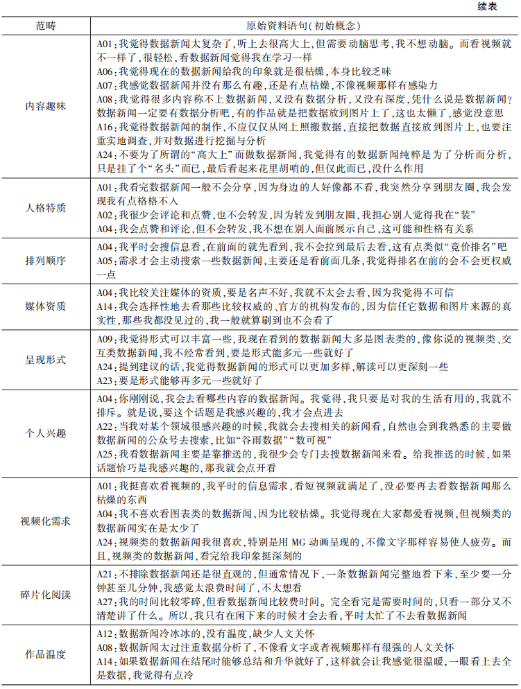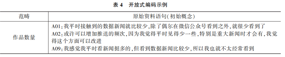 由于量化研究与质化研究有着各自的优势与不足,研究者们开始探索将二者结合:一是在量化主导的研究中引入质化研究方法;二是在质化研究主导的研究中引入量化研究方法。本文所使用的扎根理论属于后者,其在研究设计与资料收集阶段采用质化研究方法,但在资料分析中充分吸收量化研究方法的优点。因此,扎根理论作为一种质性研究方法,“填平了”理论研究与经验研究之间尴尬的鸿沟,并成为质性研究的一种基本范式,逐步渗透到社会科学研究中的多个学科[14][15]。基于此,笔者采用扎根理论这一探索性的质性研究方法,通过深度访谈收集资料,经过开放式编码、主轴式编码和选择性编码,不断比较、持续提取概念与范畴,以建构数据新闻受众接受行为理论模型,进而从理论层面寻找影响数据新闻传播的因素。