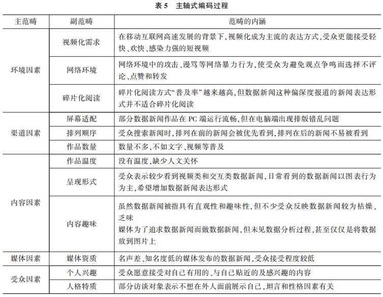 主轴式编码的目的是探索开放式编码中各个范畴之间的逻辑关系,并对其进行再次编码,从而发展出主范畴和副范畴(见表5)。通过分析发现,开放式编码中的各个范畴存在紧密关联,根据12个范畴间的相互关系和逻辑顺序,总结出5个影响数据新闻传播的范畴,分别为环境因素、渠道因素、内容因素、媒体因素和受众因素。