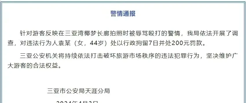 而对于网友在三亚被大妈强制拍照,抢夺手机的行为,三亚市公安局天涯分局发布警情通报称,三亚市公安局天涯分局展开了调查,对违法行为人袁某(大妈),处罚行政拘留7日,并处罚200元罚款。