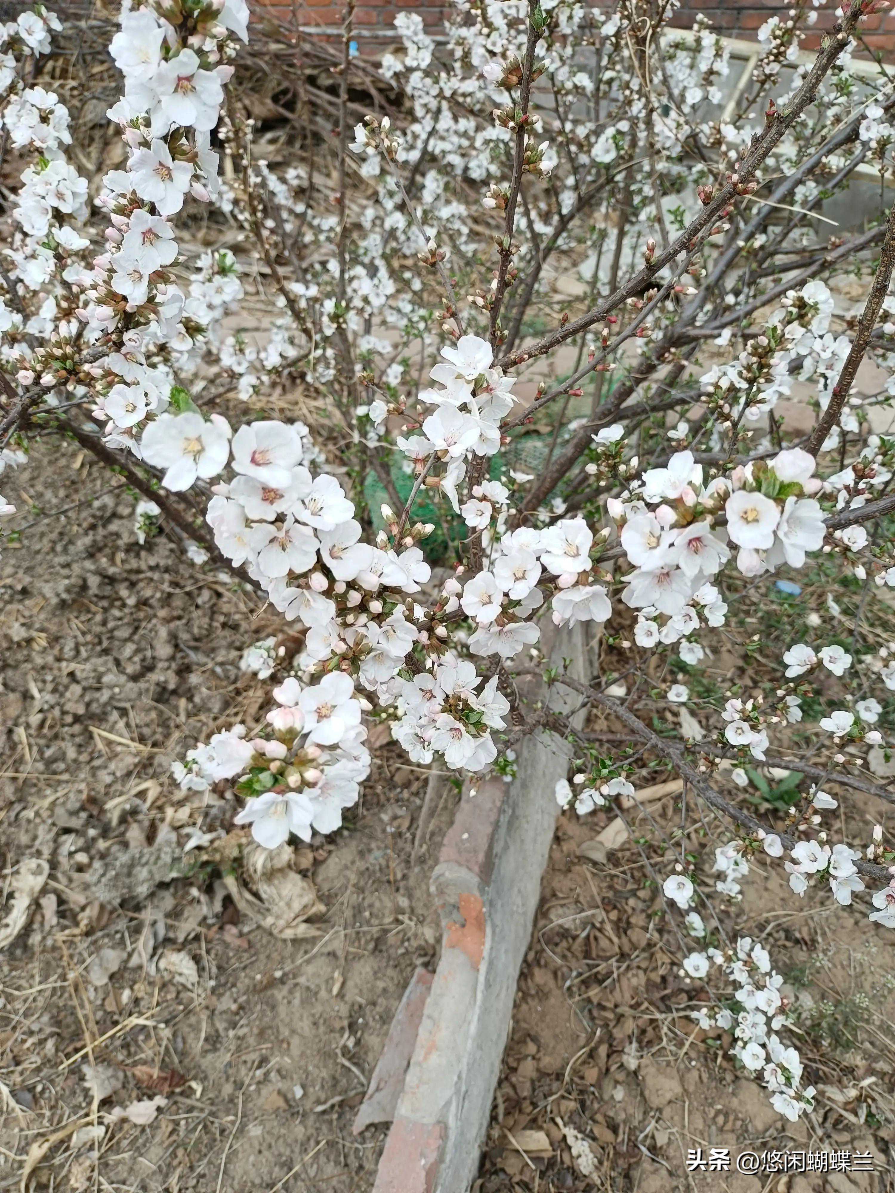 我家的樱桃树就在鸡棚的门口,每天早上喂鸡的时候,我都能看到这棵樱桃树,现在正是开花的季节。