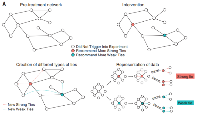 在第一次实验中,我们回顾了2015年的一个全球性实验,参与人数超过了400万。这其中的人们通过这次实验建立了超过1900万个新的社交关系。我们收集了这次实验中建立的每个关系的强度信息以及工作机会传递的结果。接着,我们又分析了2019年进行的第二次更大规模的全球实验,这次实验覆盖了全球每个大洲和美国所有州,涉及的人数超过了1600万。这其中的人们建立了大约20亿个新的关系,并且在实验期间记录了超过7000万份工作申请,帮助了大约60万人找到了新工作。在这次实验中,我们收集的数据是以每个领英用户为单位的,每个数据点对应一个独特的领英会员(即:每一项节点级别的数据)。而在2015年的实验中,我们收集的数据是以每个关系点为单位的,每个数据点对应两个领英会员之间唯一的关系(即:每一项边缘级别的数据)。具体内容体现在图1B中。