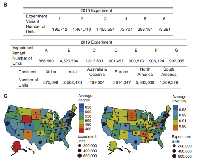 图1展示了实验设计和汇总统计数据。(A)图描述了实验设计以及在节点级和边级分析中结果数据的表现方式;(B)图展示了2015年和2019年实验中各大洲及实验变体的实验单元数量(2015年数据中有98.8%来自美国);而(C)图则展示了我们2019年实验中,按美国各州划分的平均度数、网络多样性,以及实验单元的数量。