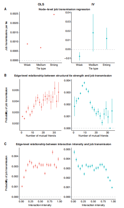 图3展示了关系强度对工作流动性的因果影响。这张图展示了在节点级别和边缘级别上,关系强度对工作传递的估计效果。在每个板块中,左列显示的是OLS分析的结果,而右列显示的是2015年进行的第一轮实验的工具变量(IV)结果。(A)图展示了弱关系、中等强度关系和强关系(根据共同好友数量的三分位数定义)对节点级别工作传递的影响;(B)图展示了基于共同好友数量的结构性关系强度对边缘级别工作传递的影响;而(C)图则展示了基于互动强度的关系强度对边缘级别工作传递的影响。