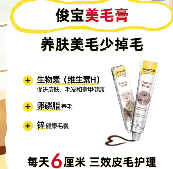 每天为猫咪补充6厘米的俊宝美毛膏,就能实现三效皮毛护理,让猫咪的皮毛更加健康、美丽。养肤美毛,从日常营养补充开始,让猫咪远离猫藓的困扰,享受健康快乐的生活!