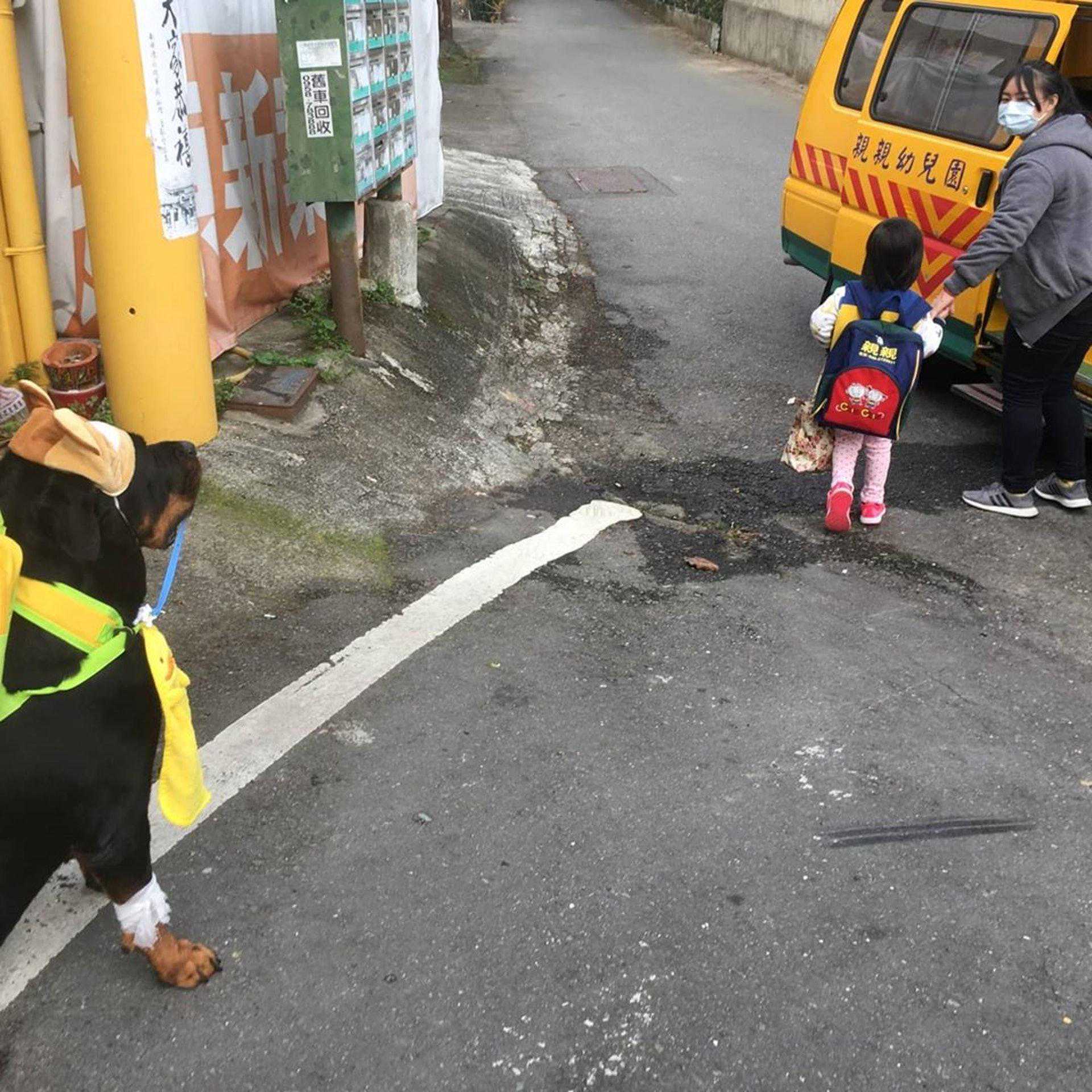 慢慢体型太大,校车上没有属于慢慢的座位,只能默默目送小主人离去。