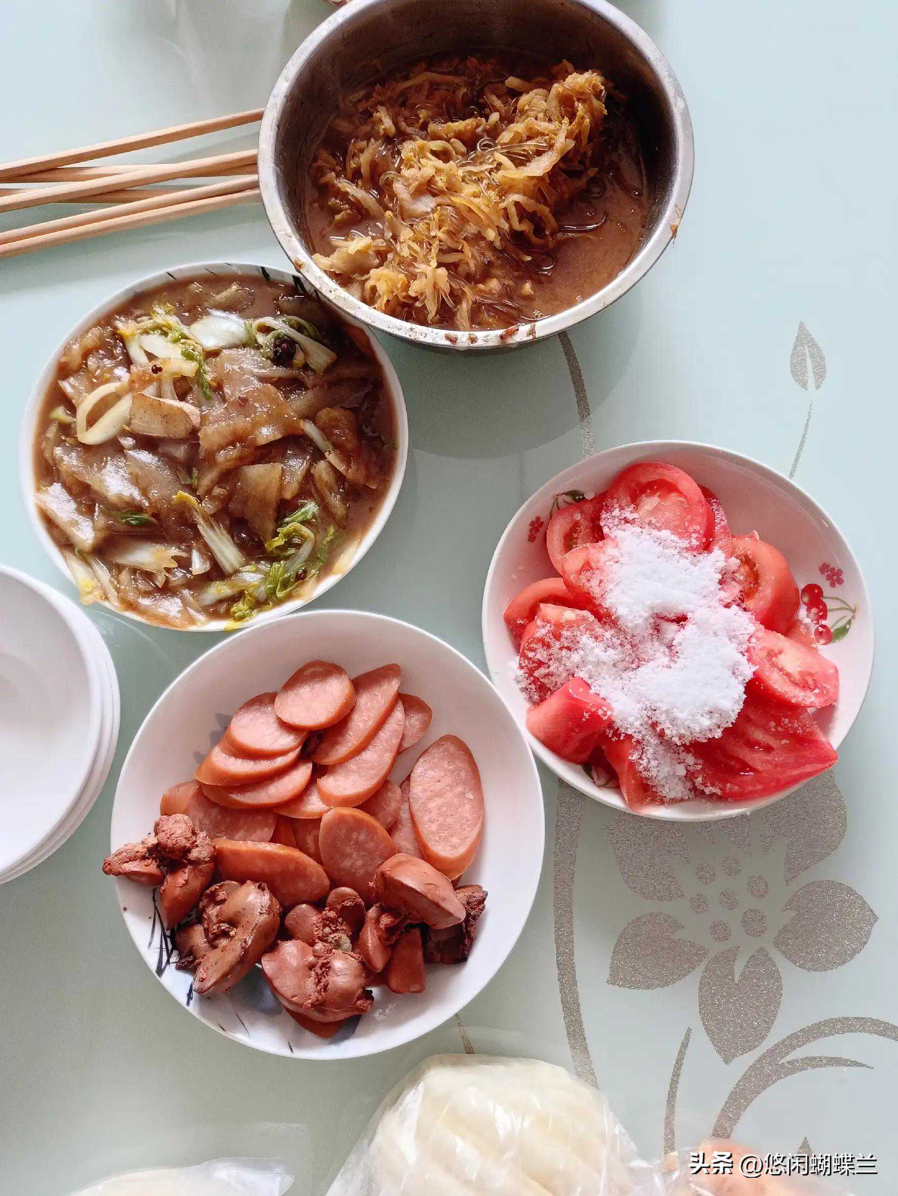 今天四个菜,一个酸菜炖粉条,一个白菜炒粉坨,还切了一个香肠,拌了一个西红柿。