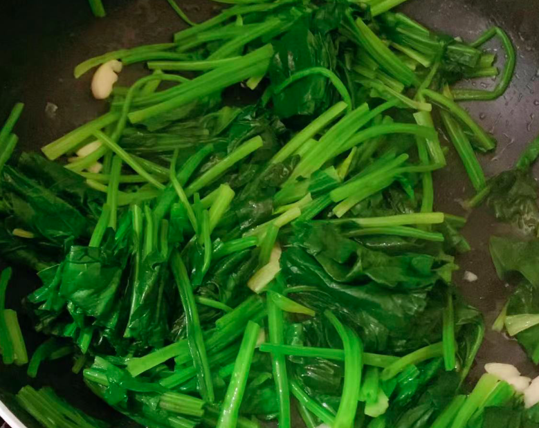 4、热锅凉油,下入大蒜朝鲜,下入菠菜翻炒均匀。