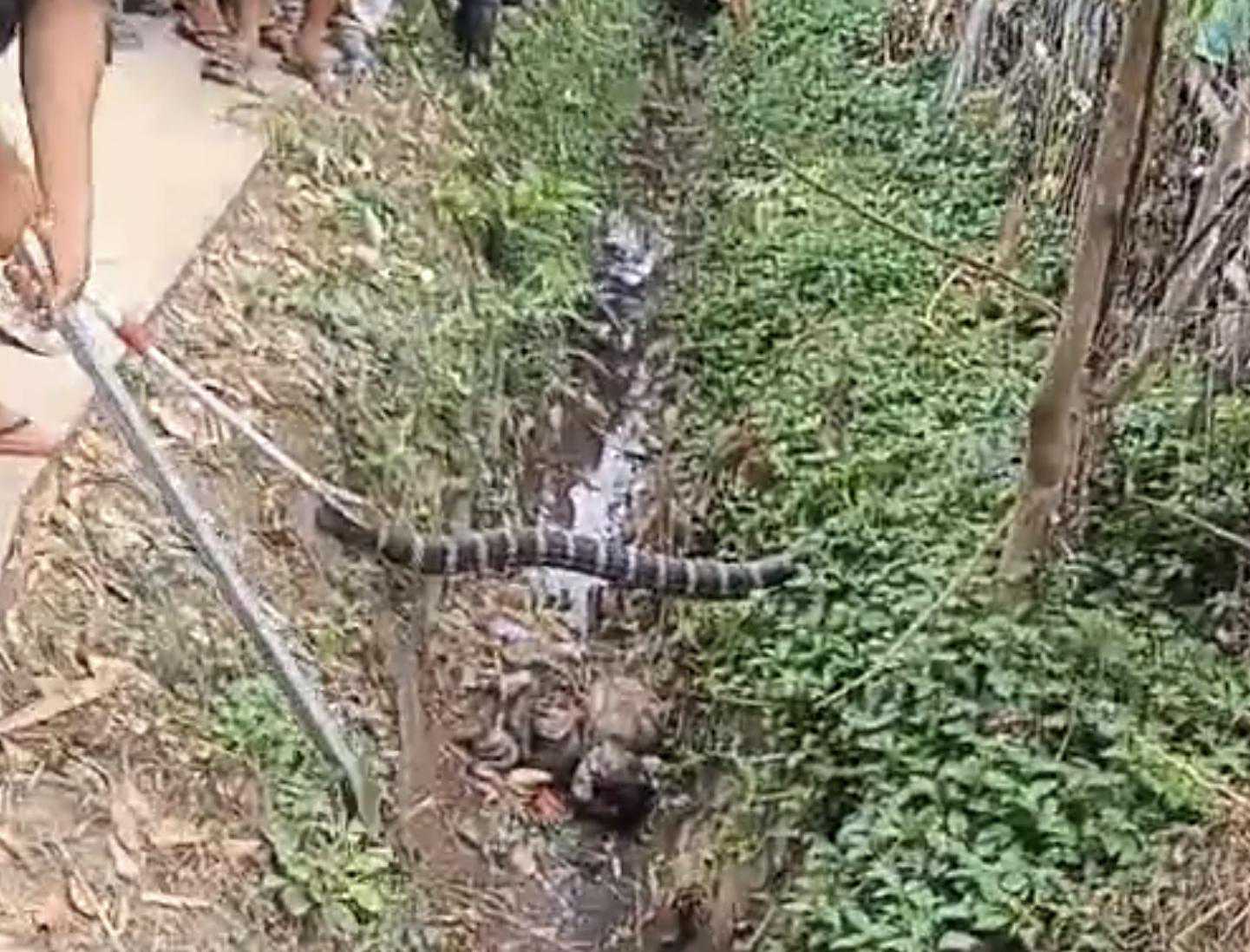 有的村民不解气,拿着铝制的方条,又“哐当!哐当!哐当!”的,给已经死掉的眼镜王蛇又来了几下,铝方条都打歪了。