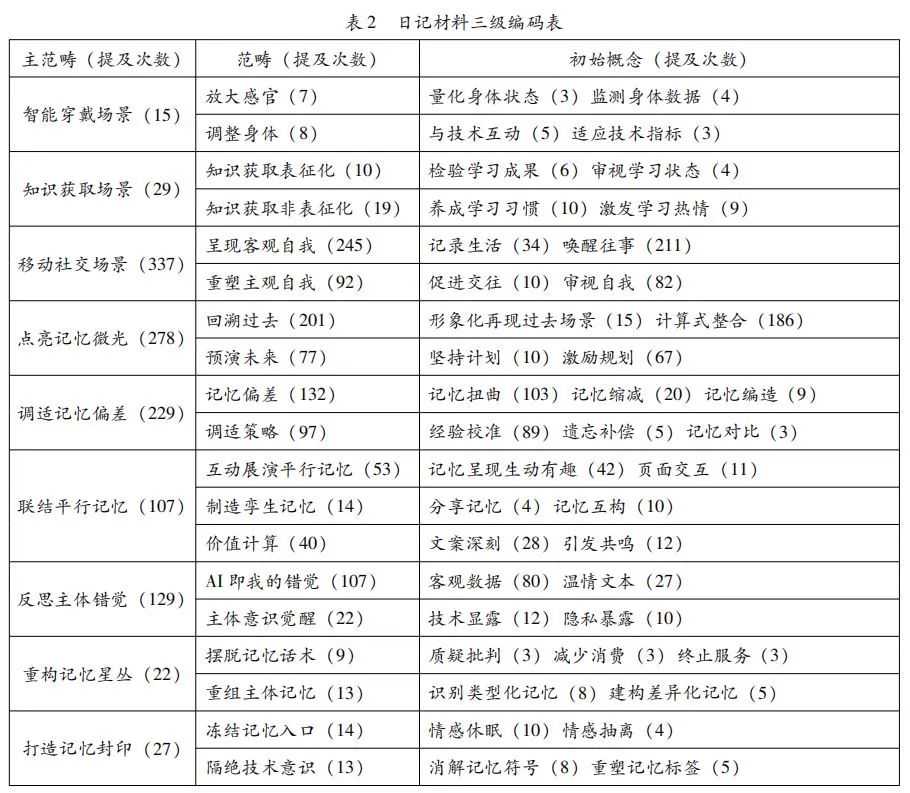 本研究对19个范畴进行比较与分类,由此提炼出9个主范畴,分别为智能穿戴场景、知识获取场景、移动社交场景、点亮记忆微光、调适记忆偏差、联结平行记忆、反思主体错觉、重构记忆星丛与打造记忆封印(表2)。
