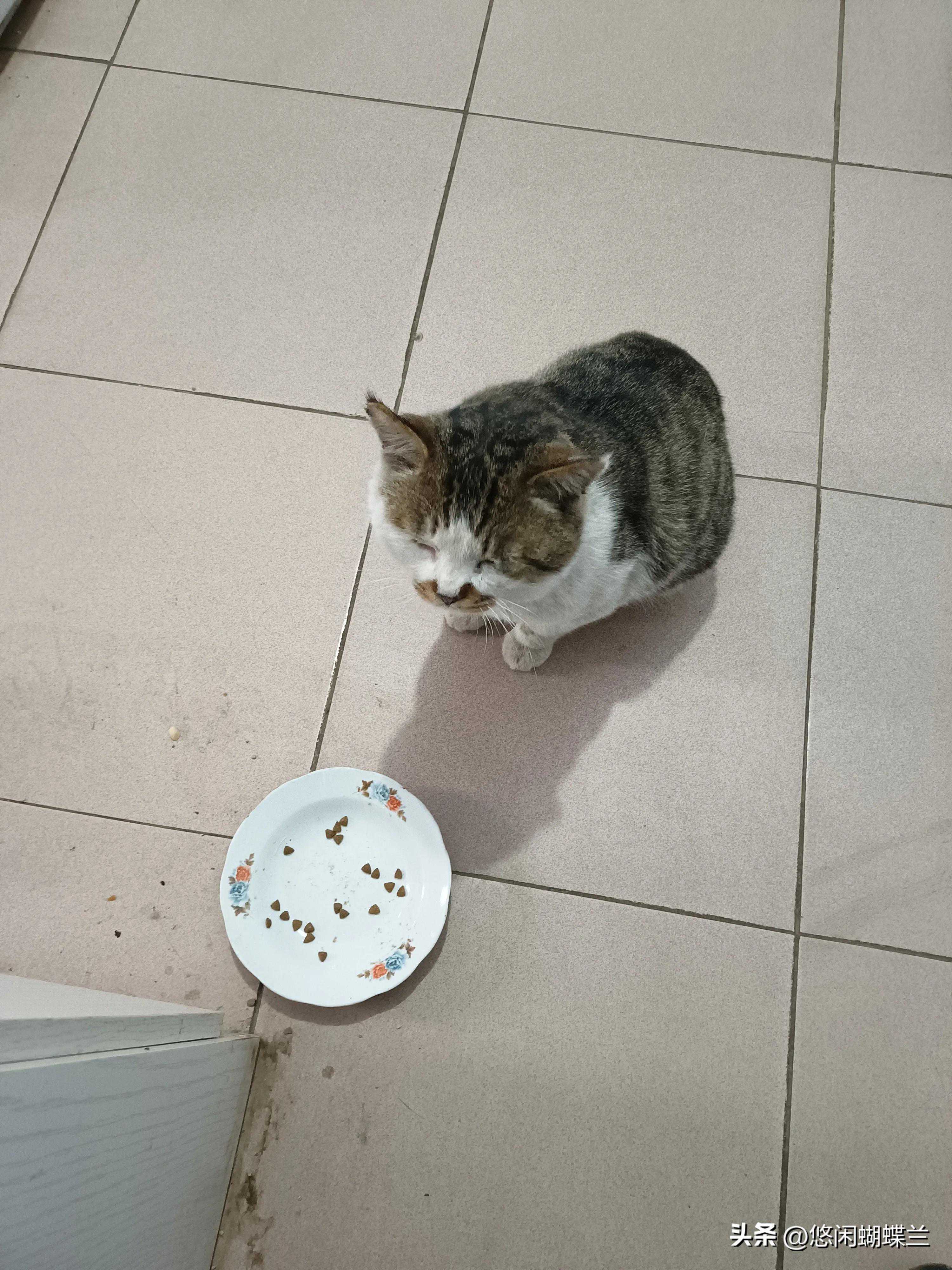 看到猫进来了,我先给猫抓了一把猫粮,放到盘子里,让猫主子先吃饭吧。