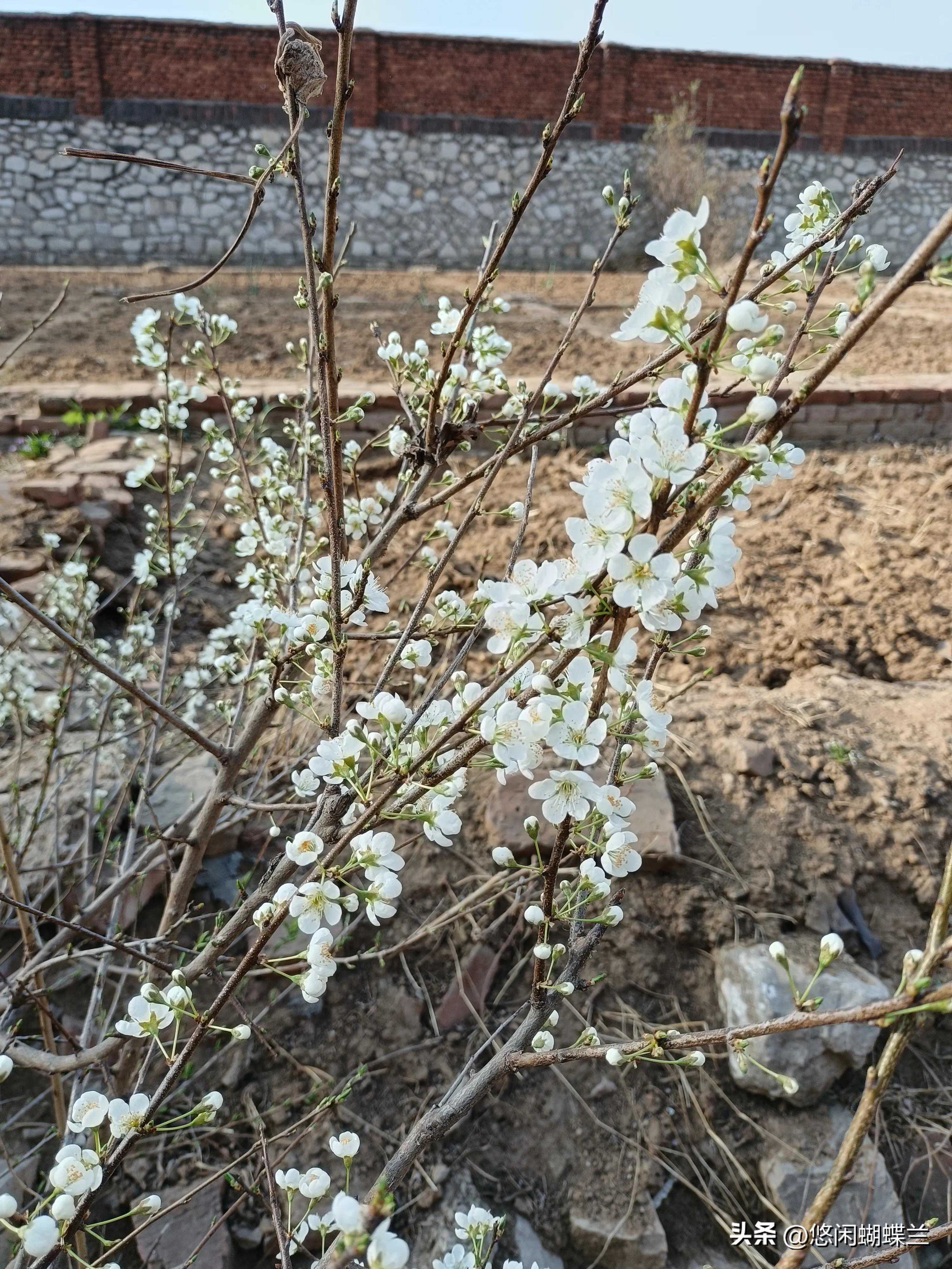 这棵李子树,就是从原来的树根下长出来的,这个地方又不碍事,我就把它留下来了,今年是第一次开花。