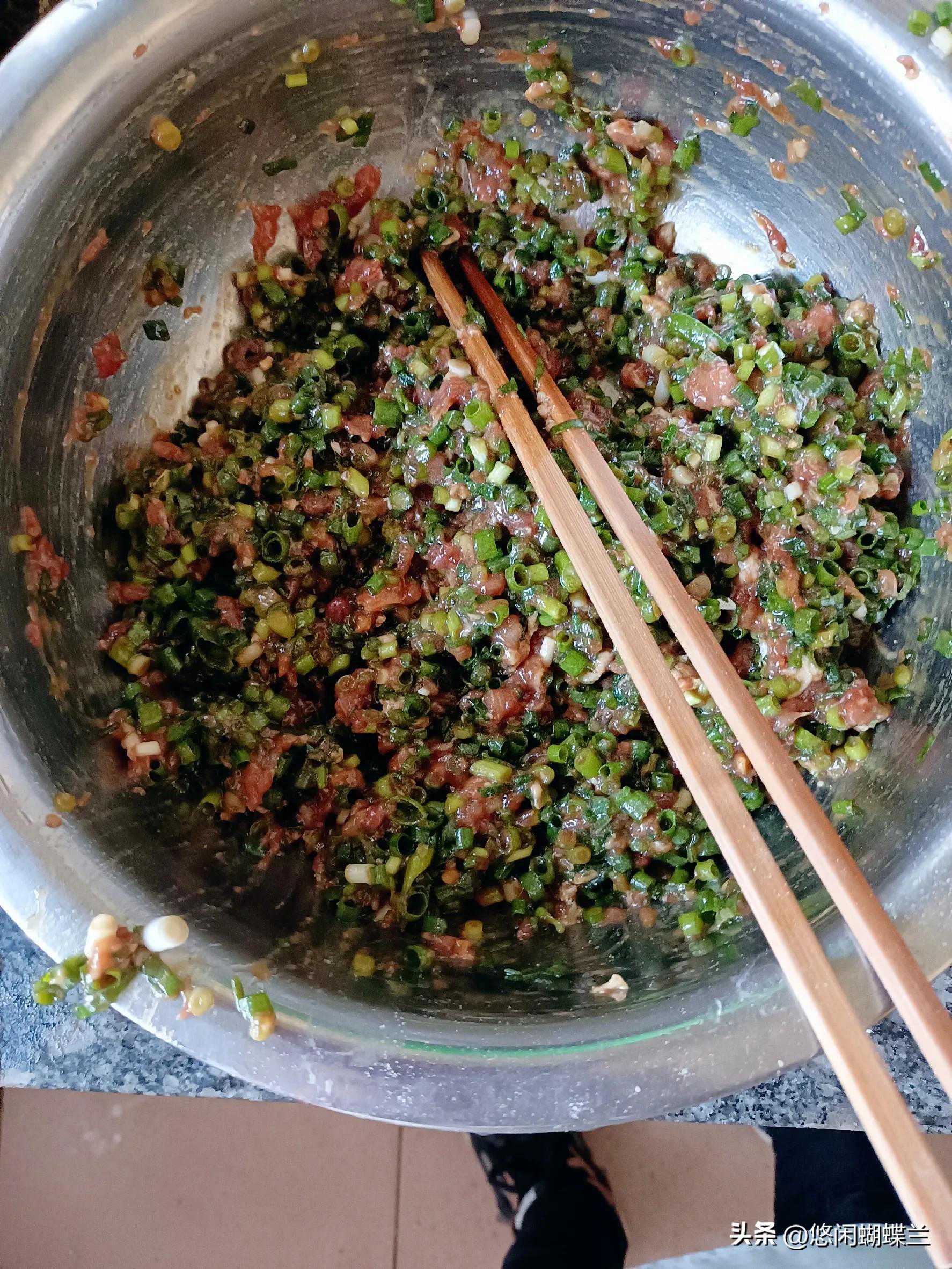 回到家赶紧做饭,把小葱洗净切碎,肉剁碎,姜切末,然后放到盆子里调味,加花生油,盐,生抽,老抽,蚝油,十三香,香油,然后加少量清水,把馅儿搅拌均匀就可以。